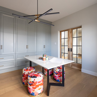 We also designed a custom-built craft table for the center of the room with funky stools that could be used by the young children, while the clients tended to their work at the built-in desk. We updated the window with a built-in bench seat with bespoke fabrics and custom made pillows in a modern colour pallet.
