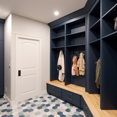 The mudroom was opened up into the pantry and a small hallway was created so it could be closed off from curious eyes when necessary. The tile floor and bespoke dark blue cabinetry really brought this space to life.